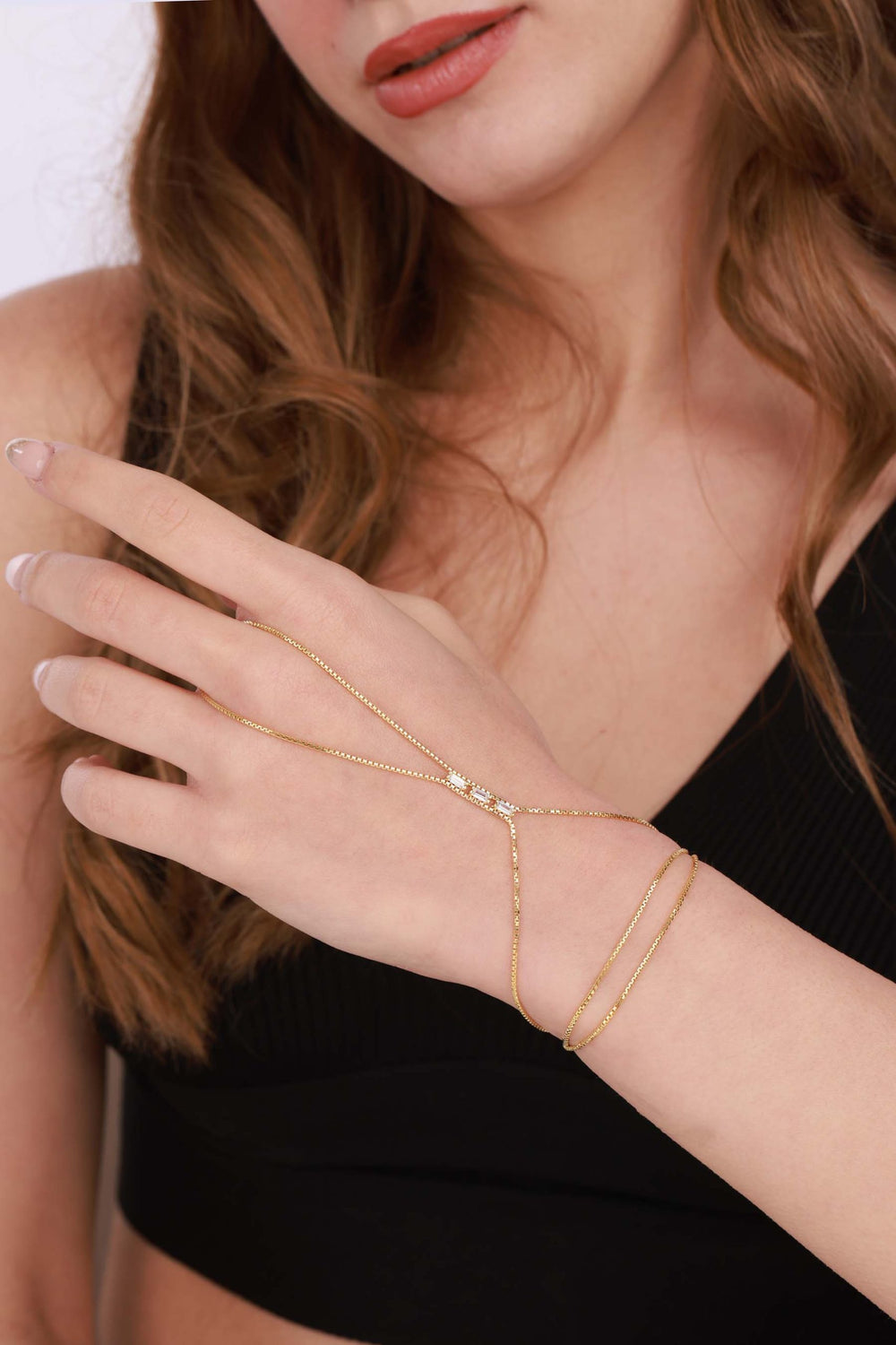 Gold Chain Gold Ring Bracelet / Hand Ring Gold Handlet Bracelet Baguette Stone with Box Chain 925 Silver Shahmeran Bracelet