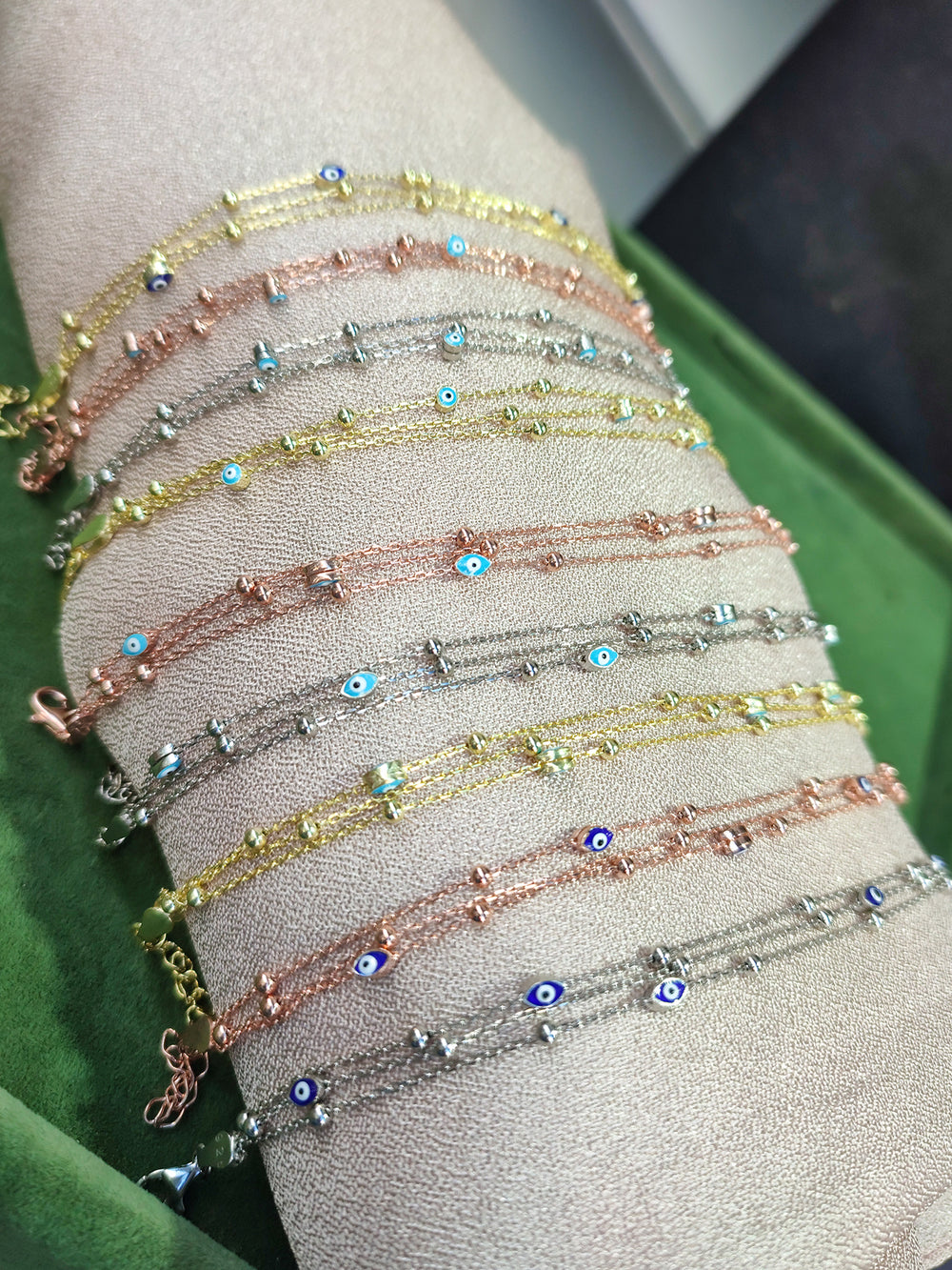 Triple Enamel Evil Eye Beaded Silver Chain Bracelet