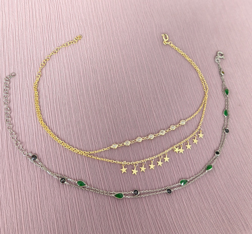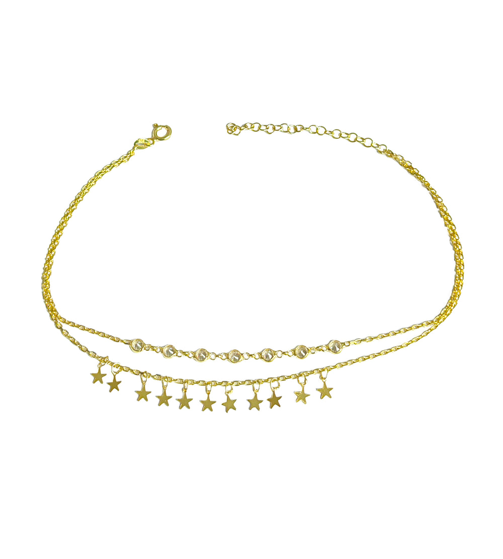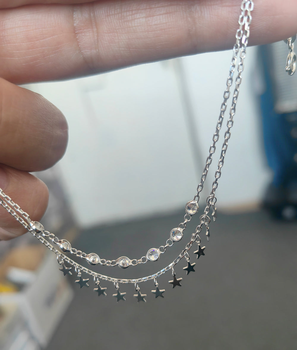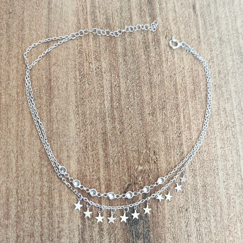 Two Row Silver Stone and Star Anklet, Dainty, and Minimalist Dangling Stars Anklet