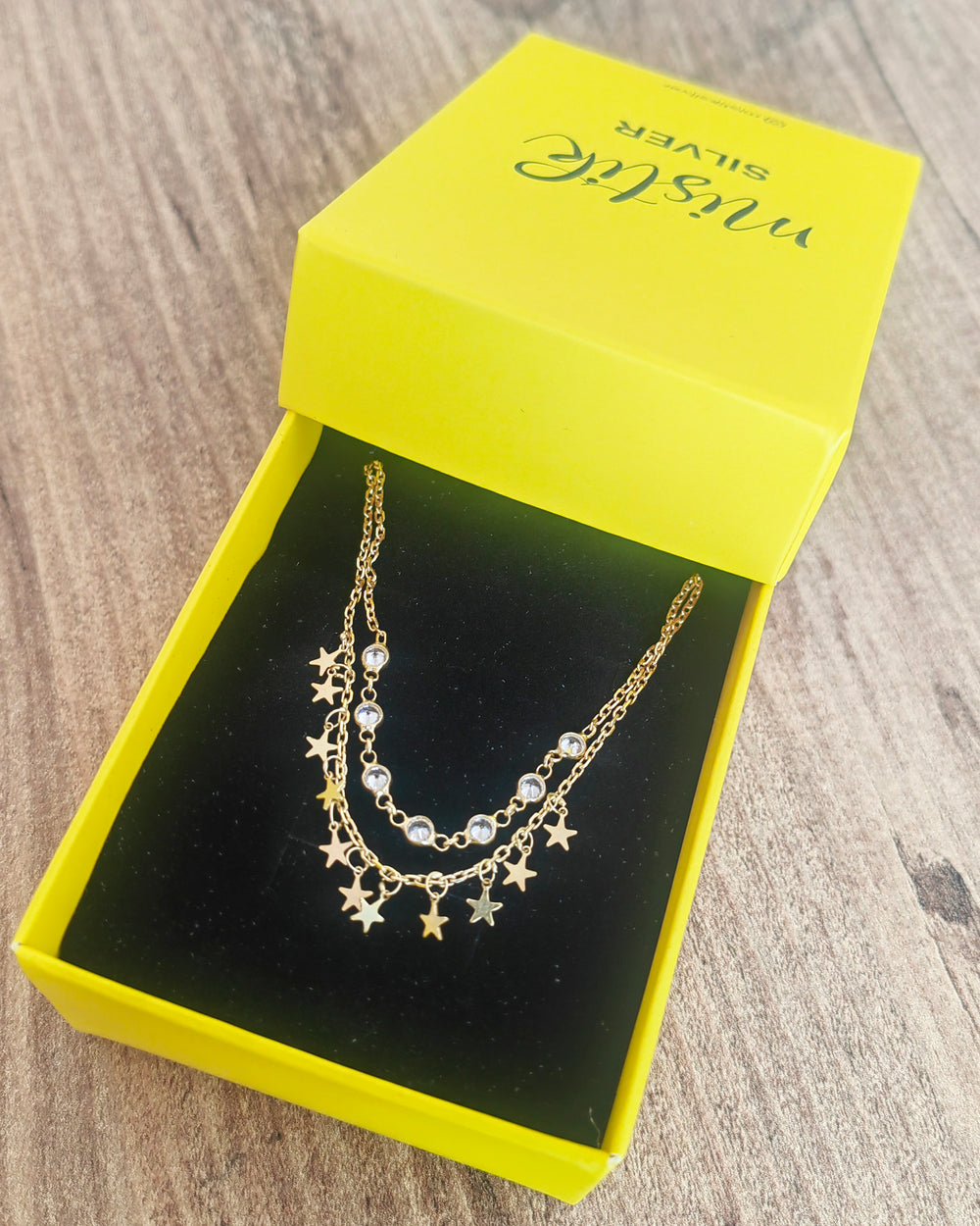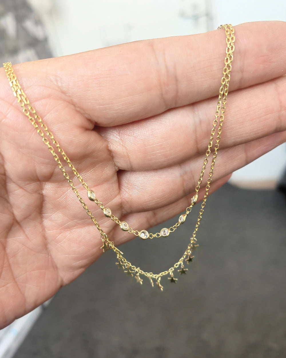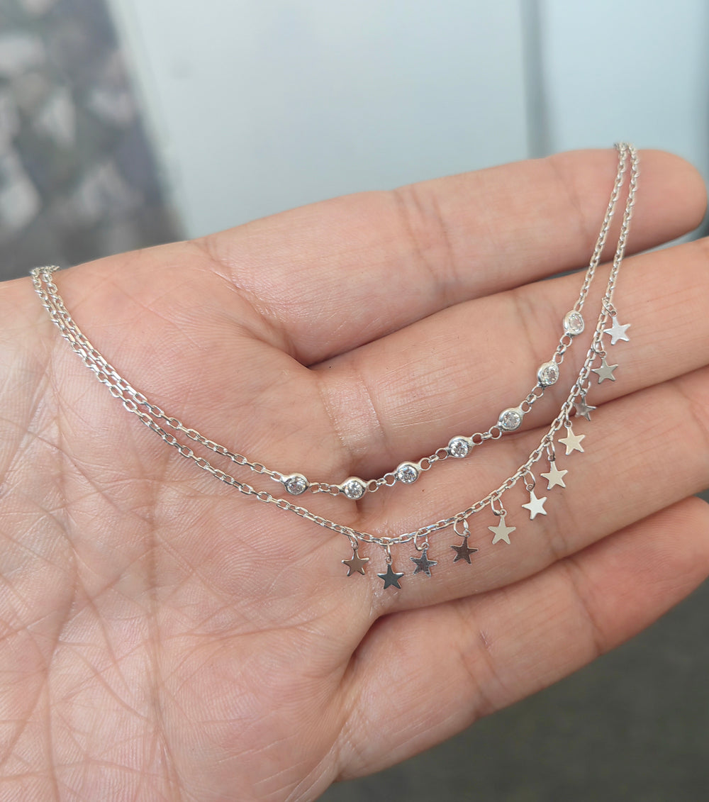 Two Row Silver Stone and Star Anklet, Dainty, and Minimalist Dangling Stars Anklet